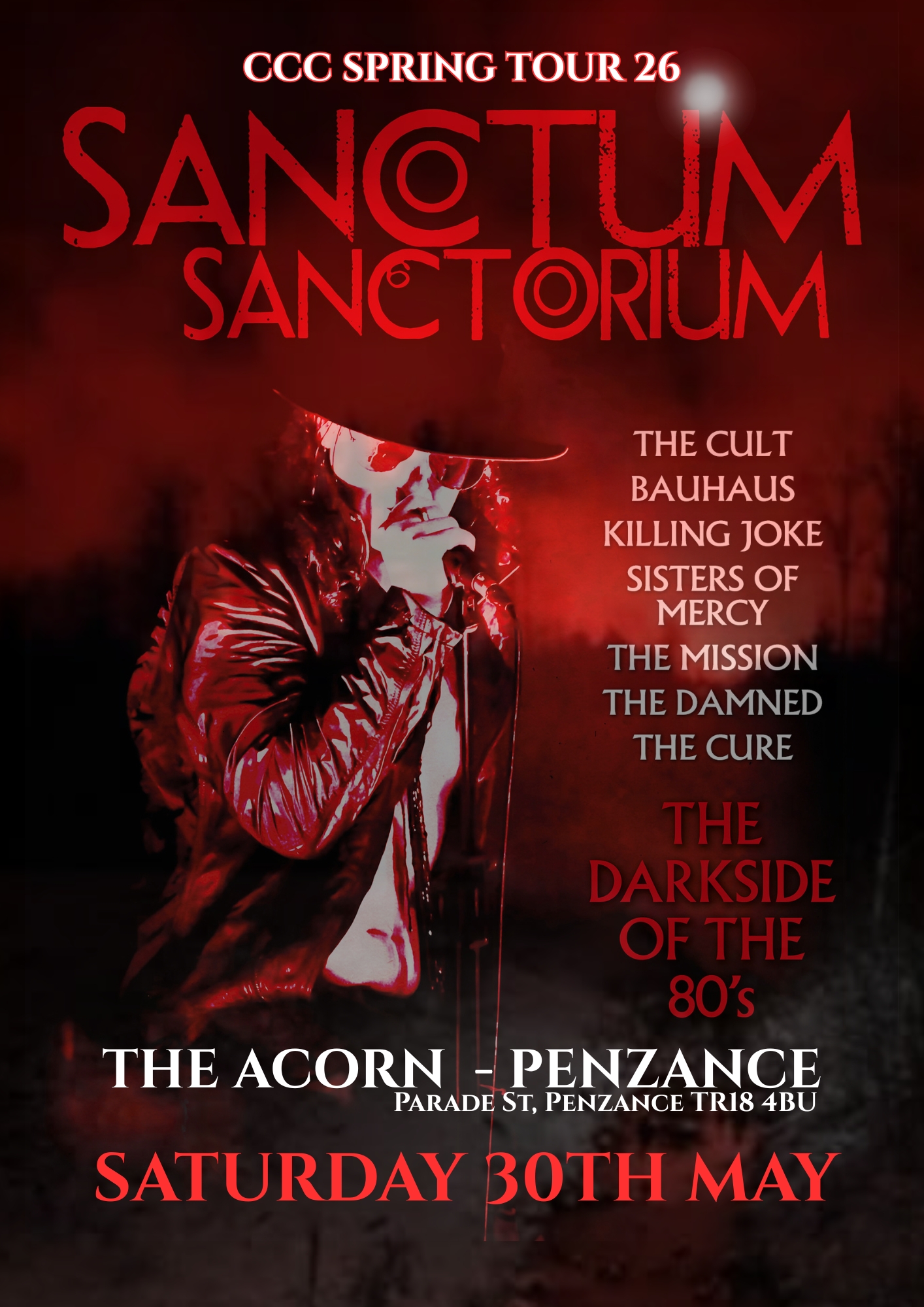 Formed through a mutual love of 80’s goth and alternative rock music. Sanctum Santorium are a live 6-piece band that faithfully recreate classic hits by artists such as The Cult, Killing Joke, Sisters of Mercy, Siouxsie & The Banshees, The Cure, Bauhaus and more. Smoke machines at the ready with the clothes and the attitude.